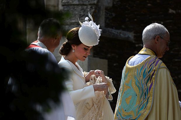 Катрин също присъстваше на кръщенето на малката принцеса Шарлот Елизабет Даяна. Херцогинята на Кеймбридж носеше бял тоалет, който е изработен от Александър Маккуин. Бялата шапка, която носеше е на Джейн Тейлър. Младата майка разбира се бе взела със себе си и 9-седмичното си бебенце. То бе возено в количката, която Елизабет II е отгледала принц Едуард и принц Андрю.