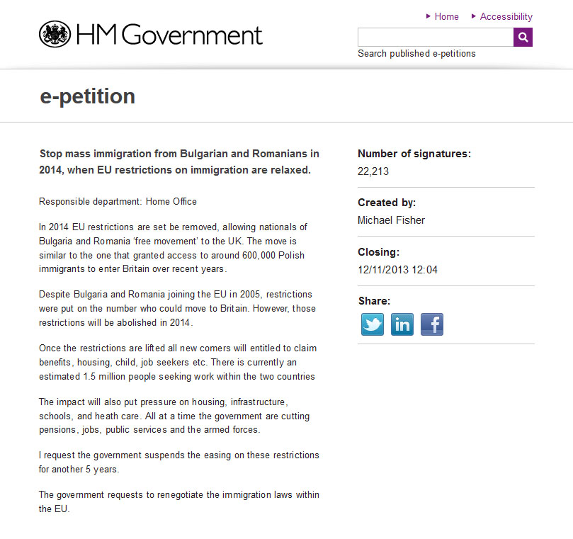 Подпишете електронната петиция, която се организира официално от самите британци в правителствения сайт за е-петиции – за спиране на медийната кампания срещу българите и румънците: