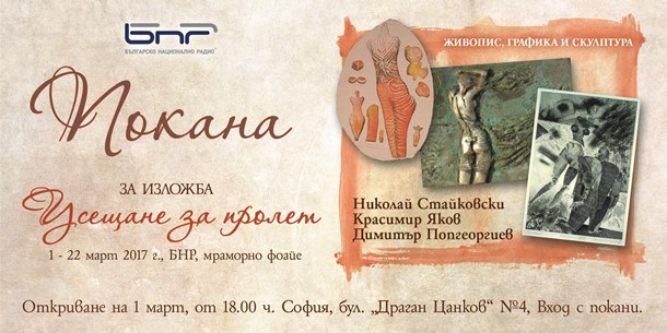 В Мраморното фоайе на Българско национално радио вече е осезателно „Усещането за пролет“. Под този надслов на 1 март трима български автори ще открият съвместна изложба – творчески синтез на жанрове, обединени от темите за събуждането на природата и празника на жената. Николай Стайковски, Красимир Яков и Димитър Попгеоргиев ще представят на „Драган Цанков“ №4 свои произведения – живопис, графика и малка пластика, с посланието за красота и оптимизъм през най-чакания сезон от годината.