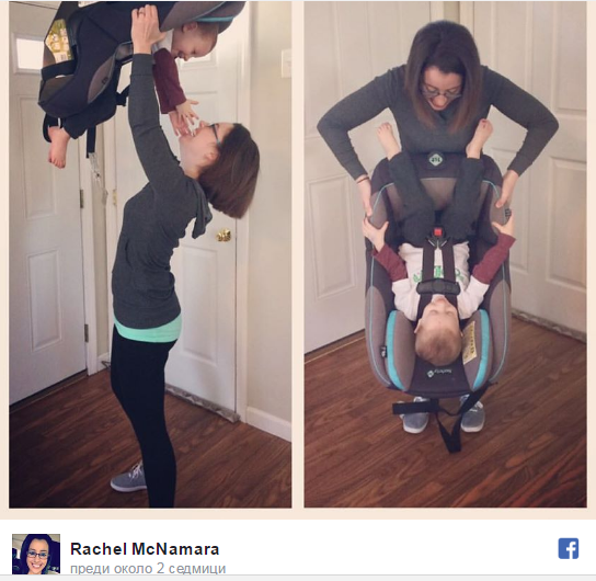 Рейчъл Макнамара е публикувала две снимки във Facebook наскоро, в които тя повдига детето си заедно със седалката му за кола над главата си и след това го обръща с главата надолу. Тя предлага на всички родители да направят същото.