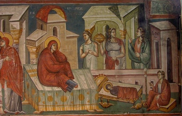 На първата икона е изобразено събитието на Малка Богородица – Света Анна е родила малката Мария, която лежи на малкото легло.