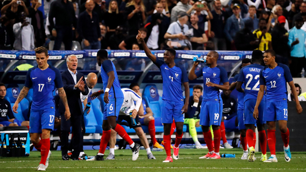 Отборът на Франция победи с 3:2 състава на Англия в контролен мач, игран на „Стад дьо Франс“ в Париж. Почти цяло второ полувреме домакините играха с човек по-малко след червения картон на Рафаел Варан в 48-ата минута.