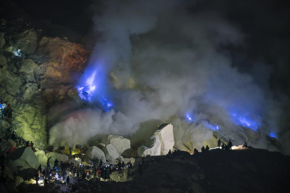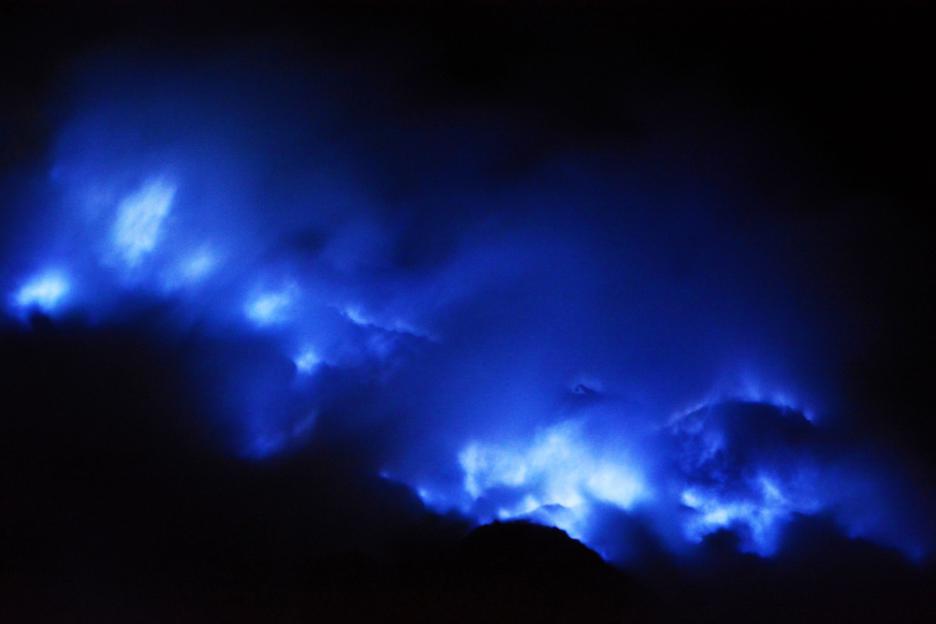 Това е Иджен, който представлява обширен вулканичен комплекс с активен кратер, чиято дълбочина достига до 200 метра. Нестандартният син цвят се дължи на обилното наличие на сяра, което прави и целия район доста токсичен.