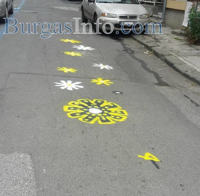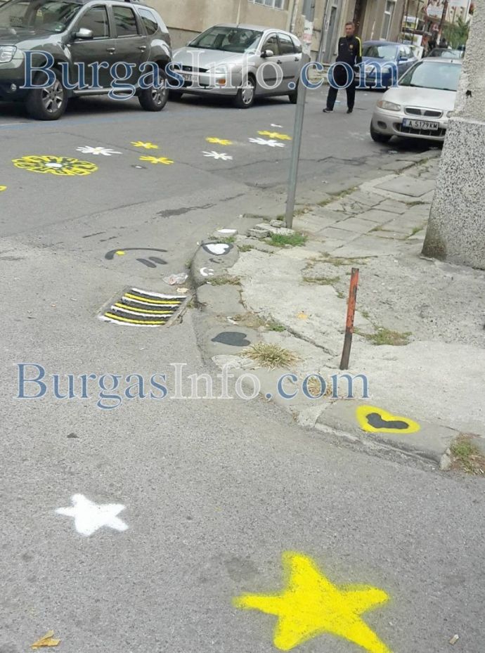 Сърчица, маргаритки, усмихнати човечета в жълто, черно и бяло оцветиха днес ул. „Войнишка“, която се намира до Славейковото пазарче в центъра на Бургас. Пъстрата украса накара младите хора, които минават в района, да се усмихнат, докато по-възрастните се учудваха какво е посланието, което са искали да оставят авторите. Оцветени са и капаците на шахтите на кръстовището с ул. „Оборище“, съобщава Burgasinfo.com.