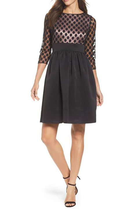Тези проницателни полка точки добавят забавен елемент с десена към тази изваяна коктейлна рокля.