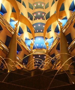 Не може да не поставим на първо място рубина в тюрбана на Дубай и целия арабски свят, която замайва с лукс, достъпен само на шейховете. Ако искате да се почувствате като в приказка от „1001 нощ“, задължително трябва да посетите най-големия хотел в света и единствения 7 звезден хотел на планетата. Създаден е по проект на Том Райт и с височината си от 321 м. е най-високият хотел в света. Построен е върху изкуствен остров на плажа Джумейра и е свързан с останалата част от града посредством самостоятелен виещ се мост. Строителството на хотела започва през 1994 г. и отваря врати на 1 декември 1999 г.