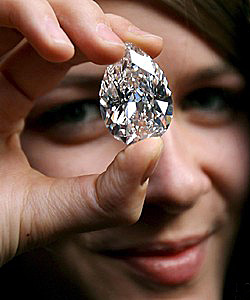 10. На десето място в тази неповторима класация се нарежда диаманта на хилядолетието Star , с тегло 203,04 карата! Този перфектен вътрешно и външно диамант е с крушовидна форма (общо 54 фасети). Първоначално, необработеният камък е 777 карата намерен в Мбужи-Майи района на Заир (Демократична Република Конго) през 1990 година. Били са нужни 5 месеца проучвания и планирания за намалявания на необработения диамант в 3 части. Стойноста на това “бижу” не е била разкрита, но диаманта на холядолетието Star е бил осигурен за 100 милиона английски лири, въпреки че това е една малка част от истинската му стойност.