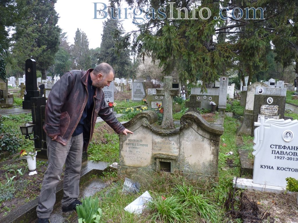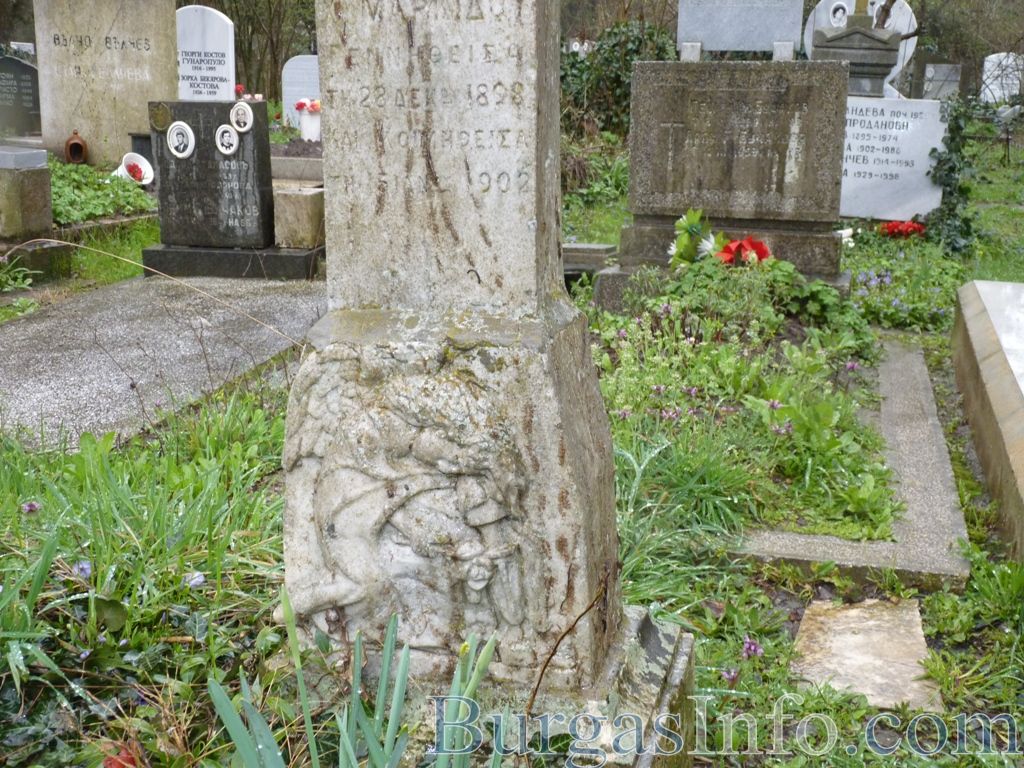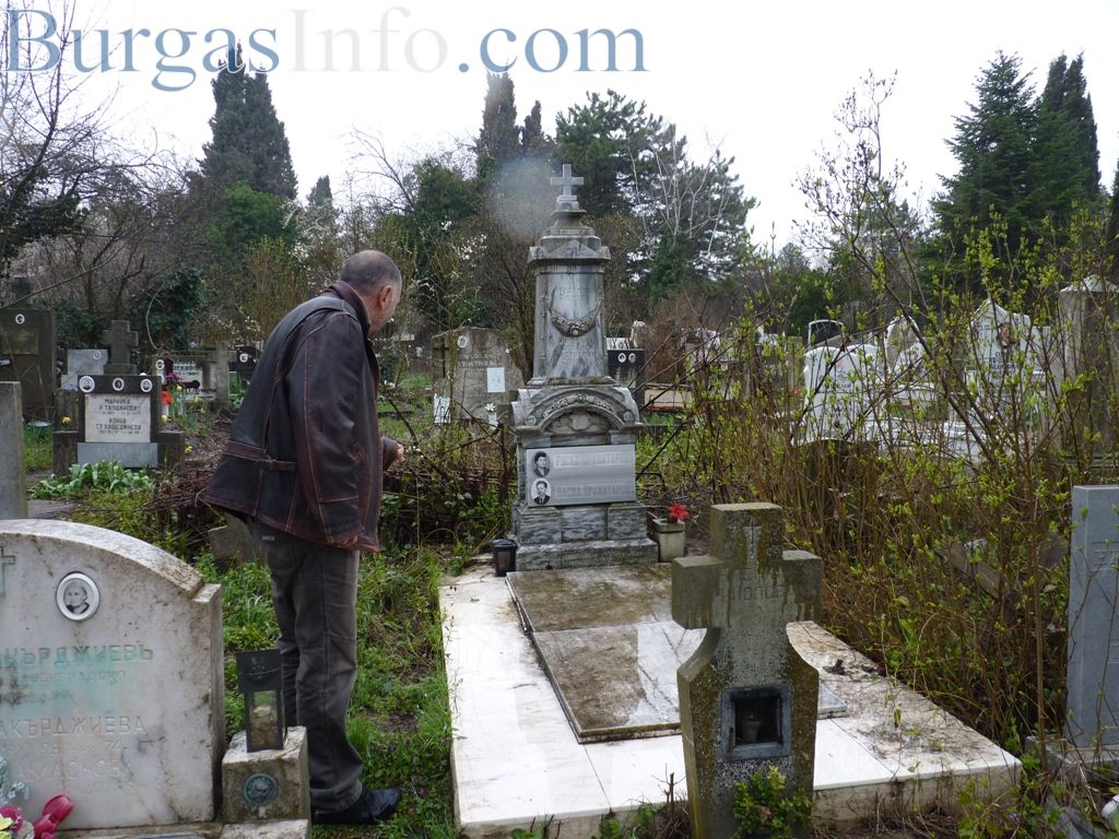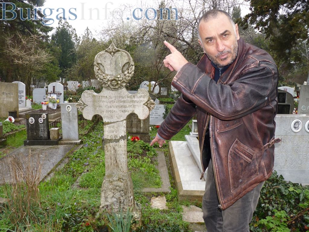 „Роднините  са можели да преместят не само останките, но и надгробните паметници от старите в новите гробища.  Този например е местен  поне два пъти. Ние не знаем какво се е случило, но със сигурност е така. По какво съдим? Името на последния  покойник, обозначено с кръст,  на този сравнително по-голям паметник,  с подробен надпис на гръцки език, е с дата от 1902г. Това е годината на смъртта. През 1902г. гробищата са било  до днешния Бургаски свободен университет. Следователно близките веднъж са го преместили в тогавашните нови гробища до Окръжна болница, и втори път са се възползвали от периода между 1962г. и 1975г., за да го  пренесат тук, ако не е имало и нещо междинно”, обяснява Митко Иванов.