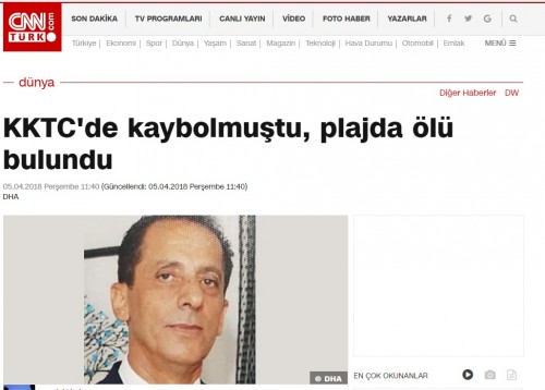 Кипърскотурските власти заявиха, че тялото е разпознато от сина му, който отиде вчера в окупираната част на Кипър.