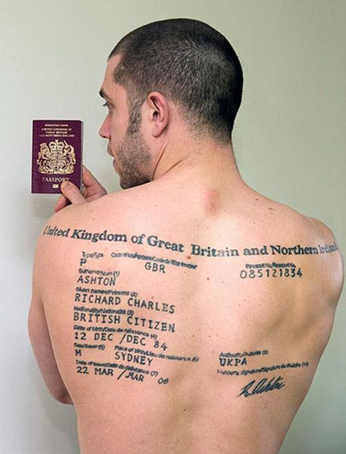 изписан върху кожата му. Той си е татуирал паспорта на гърба през 2006 година – тогава бил на екскурзия в Австралия и искал да запомни тази ваканция до края на живота си.